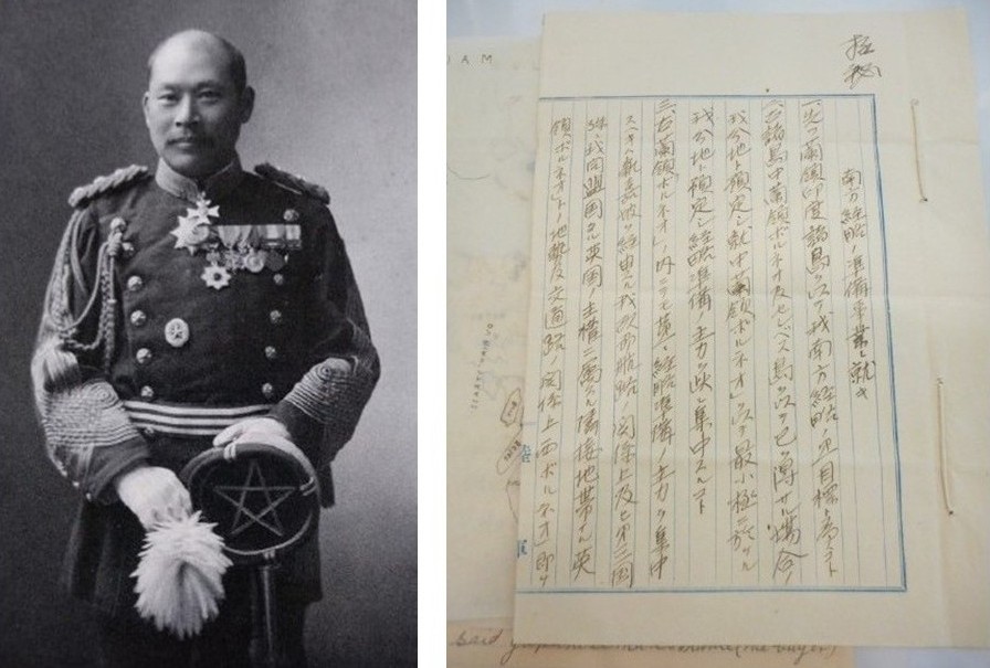 Nanpo keiryaku no junbi sagyō ni jiù ki . Meiji 43 toshi 8 tsuki 1 hi . Katajikena chi utsunomiya tarō kashiko hatsu koyama aki saku jinkei otona 南方経略ノ準備作業ニ就キ.明治43年8月1日.辱知宇都宮太郎畏発小山秋作仁兄大人 [On the preparation for the Nanpo Operation, 1 August 1910. From Utsunomiya Taro to Koyama Shusaku], Lim Shao Bin Collection, National Library Singapore. (Accession no. B32428444I) ↩
