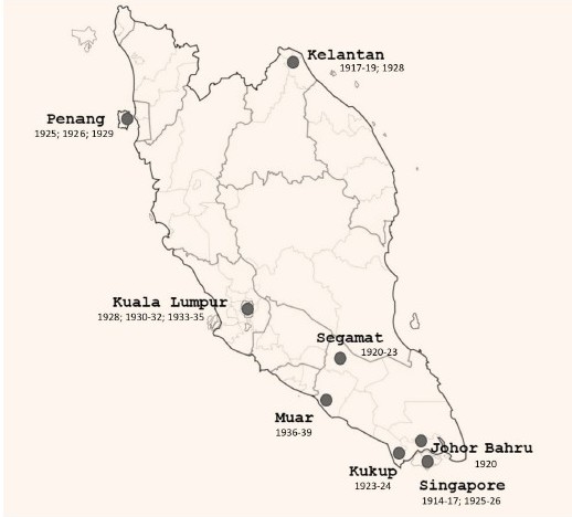Mapping his career also highlights that alongside his conception of himself within a broader Malayan imperial space, his career is firmly rooted in relation to Britain as “home”. Though his visits to the United Kingdom were infrequent, they were associated with significant events such as promotions, relocations and even his marriage in the late 1920s, as well as being the site of his eventual retirement. It is possible thus to view his career in Malaya as developing within a specific local context framed by movement and the development of particular skills and knowledge, but also mediated by this continued relationship with and dependence on networks of connection to the United Kingdom.