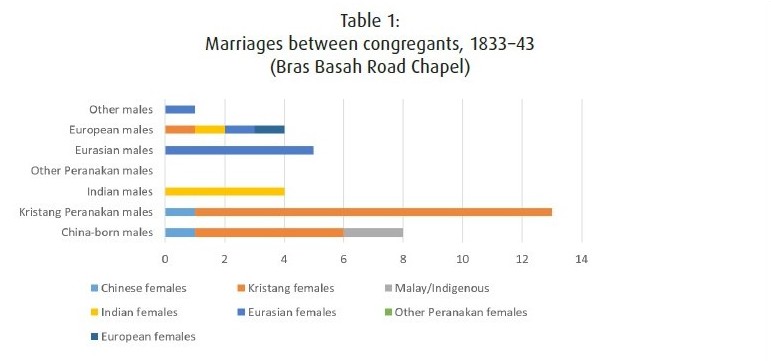 Between 1833 and 1843, eight marriages involving China-born men were celebrated at the Roman Catholic chapel on Bras Basah Road, mostly with women from the Melaka-born Kristang Peranakan community. In addition, two married local women of Orang Asli descent28 and one married an ethnic Chinese woman. Within the Melaka-born Kristang Peranakan community, out of 19 marriages, 12 were between fellow Kristang members, one with a Chinese woman, five with Chinese men, and one with an Italian man. Among the Eurasians, there were five all-Eurasian unions, one intermarriage with a European and another with an unidentified male. There were four all-Indian marriages, and only one intermarriage with a European.