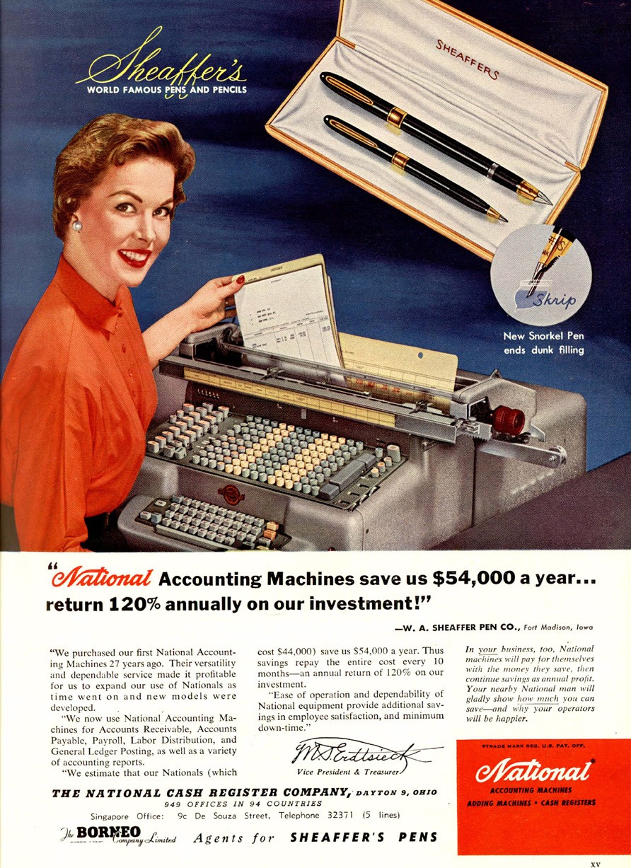 On the media front, NCR was perhaps the pioneer in glamorising and feminising accounting machines in colonial Singapore, as exemplified by a 1957 print advertisement featuring an endorsement of its products by the Sheaffer Pen Co. (Figure 3). The text endorsement was, however, secondary to the image of a Caucasian woman with a broad smile, striking red blouse and neatly permed hair, pulling a printed bill from an NCR accounting machine.