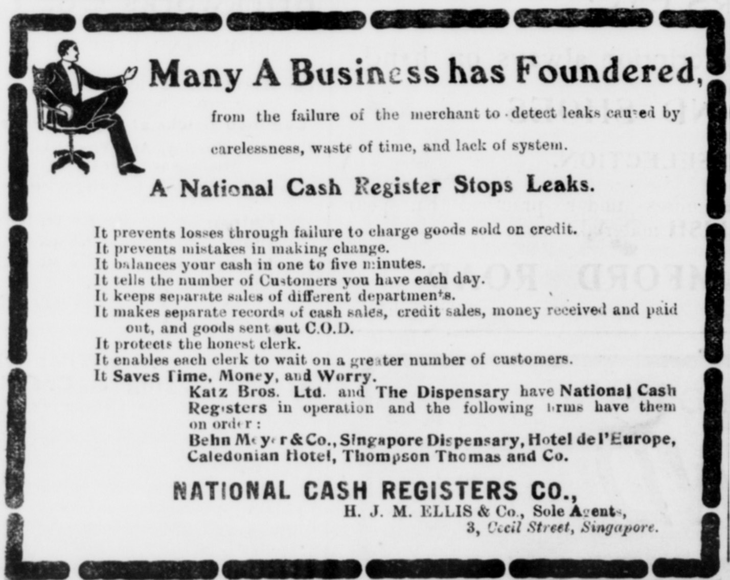 The National Cash Register Company was formally incorporated in Dayton, Ohio, in 1884. Its first advertisement in the broadsheets of British Malaya appeared some two decades later, warning of the problem of inefficiency and theft in manual accounting systems, and promising that “a National cash register stops leaks”.25 This 1905 advertisement in the Straits Times heralded the start of NCR’s marketing and publicity campaign in the region, conducted through the media and public exhibitions.