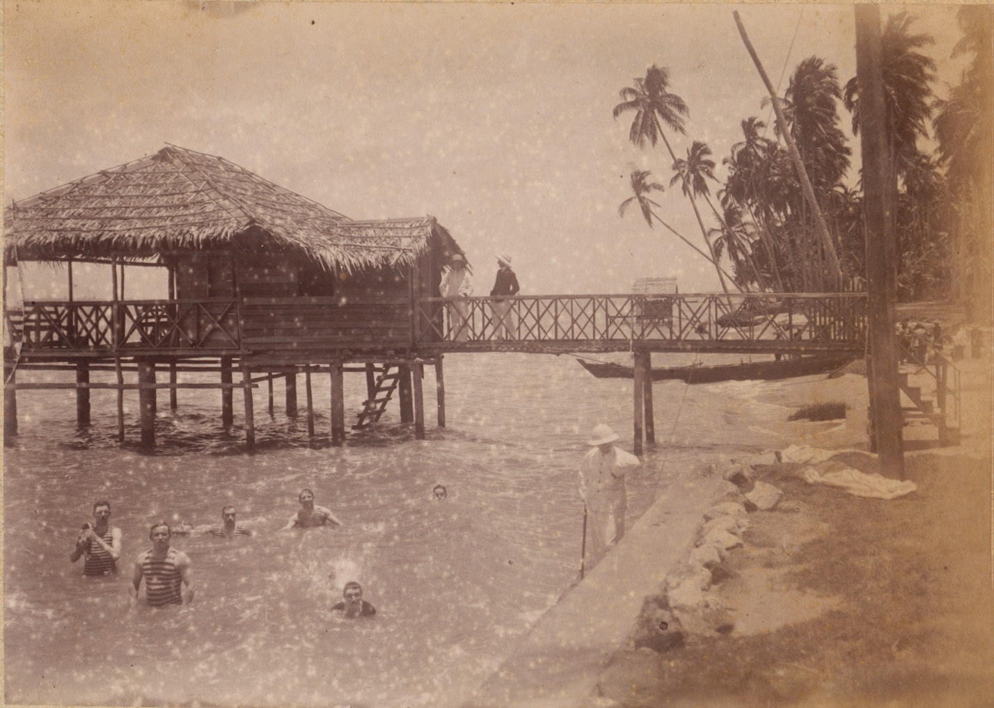 European sailors arriving in Singapore encountered a tropical and at times oppressive heat, as well as year-round warm waters, and they were clearly interested in bathing in the sea. From the 1820s, they often dove into the harbour waters beside their ships both to clean themselves and to enjoy the water, in a practice known as “bathing ship-side”. The early press advised against this activity given the potential dangers of drowning or being taken by a shark, and some did die while bathing ship-side.14 The warnings reduced the practice for a time, but it would return and the warnings resumed. From the recurring press warnings, it seems that bathing ship-side in open water continued throughout the 19th century.15