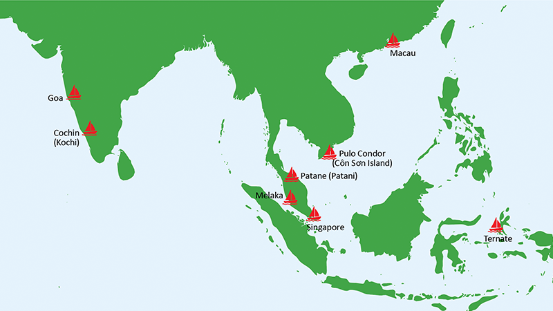 The Portuguese ships bound for the Chinese coast left Melaka and stopped at “the tip of the land, Singapore […], where the path for the ships narrows”. Going up the coast, they touched the kingdoms of Pam and Patane, on the eastern coast of the Malay peninsula, where they made a stopover. From there, crossing the Gulf of Siam to the northeast, they saw “the length of Siam” and its river Menon, which bathes “a thousand unknown nations”. They then headed for the island of Pulo Condor, located on the southeast coast of the Indochinese peninsula, bordering Cambodia and within sight of the Mekong and Champa rivers. From Pulo Condor, the route of the Portuguese ships followed northwards, along the coast, skirting the coast of “Cochinchina” (now known as Vietnam) to Pulo Catão, an island located at the southern entrance to the Gulf of Tonkin. Passing south of the large island of Hainan, the Portuguese were already skirting the “proud empire” of China. The ships then headed for the islands off the coast of the Chinese province of Guangdong. In 1562, the port they called at was Macau, where the Portuguese had recently established themselves. It was the port of departure for goods from China and the port of entry into the Middle Kingdom for products from Goa, Melaka, the Moluccas and Japan.