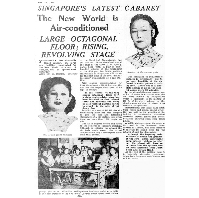 “Page 7 Advertisements Column 2: New World Dance Palace,” Morning Tribune, 28 July 1938, 7. (From NewspaperSG); Wong Yunn Chii and Tan Kar Lin, “Emergence of a Cosmopolitan Space for Culture and Consumption: The New World Amusement Park-Singapore (1923–70) in the Inter-War Years,” Inter-Asia Cultural Studies 5, no. 2 (2004): 279–304, https://www.tandfonline.com/doi/abs/10.1080/1464937042000236757. ↩