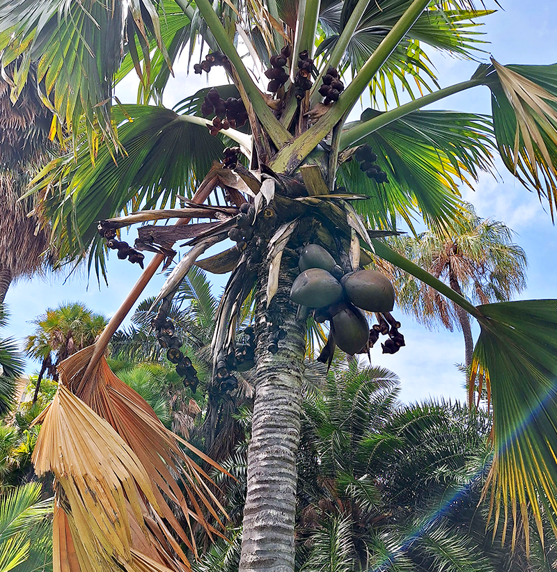 In 2012, Gardenwise, the SBG’s magazine, reported that the Gardens possessed “three mature double coconuts, one female and two males, plus several younger trees”. The mature individuals likely stemmed from the 1955 planting. SBG staff have since successfully pollinated the female tree using pollen from the male plants on several occasions, resulting in a growing number of young palms and developing fruits.13