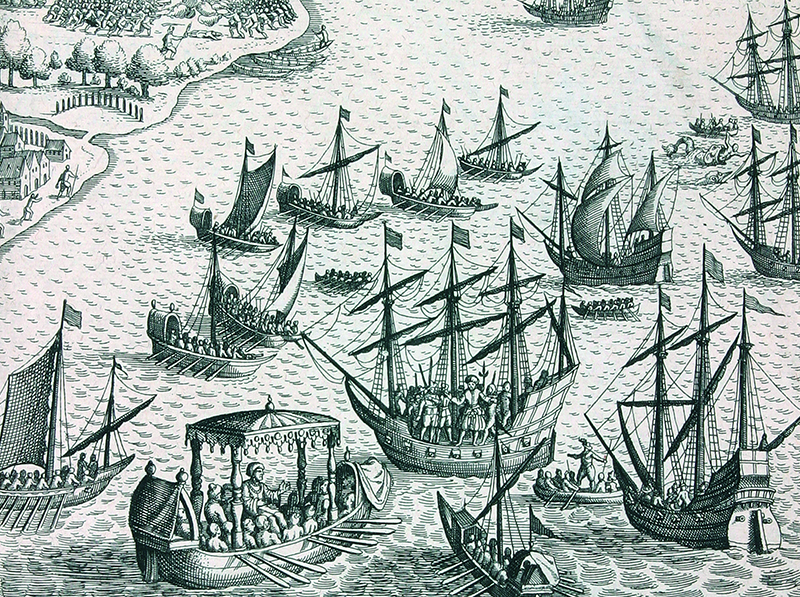 The other, engraved in 1607, shows Raja Bongsu of Johor, dressed in elaborate Turkish-style robes, in his galley (prahu; a type of boat propelled solely by oars) heading towards the Dutch flagship Zierikzee to meet with Vice-Admiral Jacob Pietersz van Enkhuysen after the battle against the Portuguese in the Johor River and Singapore Strait in 1603. The left of the etching shows a small part of a European-looking city that may have been intended to represent Singapore.9